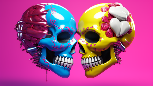 two lovers reunited, loving embrace, and heading to heaven, transparnt angels, light, clouds, skulls, flying, dream background, beautiful, peaceful --chaos 100 --ar 2:3 --stylize 50