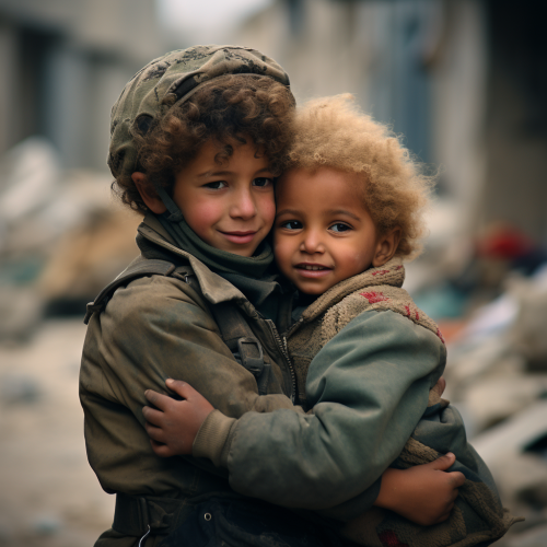 one israeli child with israel flag in the hand hugging a palestinian child with palestinian flag in the hand