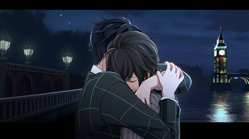 In the foreground, a young black-haired lady embracing and kissing a young blond-haired man. In the middle ground, the Thames river. In the background, London's Parliament and Big Ben at night --ar 16:9 --s 50 --niji 5 --style original