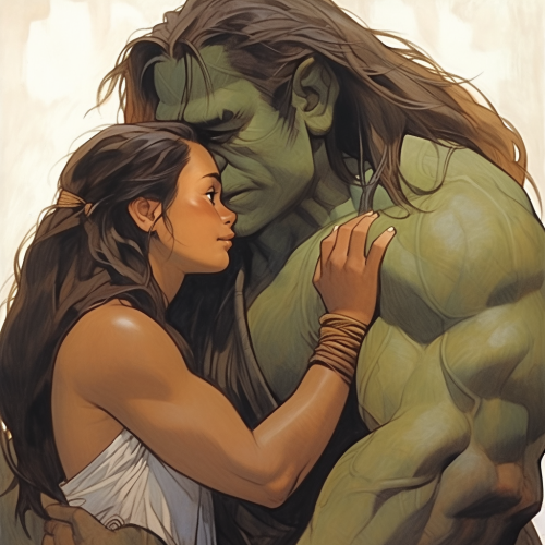 (masterpiece), (best quality), (ultra-detailed) Two figures. Side-by-side and facing the viewer. A heavily muscled and pretty tanned Amazonian ogre girl in jeand and a green mucle shirt standing behind her shorter cute human girlfriend. She has one arm around her waist and is leaning over her to kiss her on the cheek. The girlfriend has her head turned to look up at her and smiling happily. In the style of Studio Ghibli, loose gestures, oshare kei, strong facial expression, tightly composed scenes. Vector graphic illustration,8k --ar 1:1 --niji 5