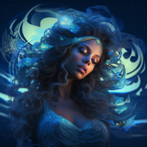 Illustration of an up close editorial photograph of a beautiful telepathic and euphoric translucent latina mermaid surrounded by illuminated blue and yellow fractal waves, super full blue moon in the night sky in the background, v 5.2