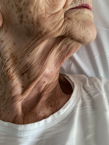 A phone photograph of an elderly woman's neck, with multiple small lesions on the skin, showing wrinkles, white bed sheets in the background, posted to Reddit in 2019. The photo quality is average, taken with an iPhone X. --ar 3:4 --style raw --s 50 --v 6.0