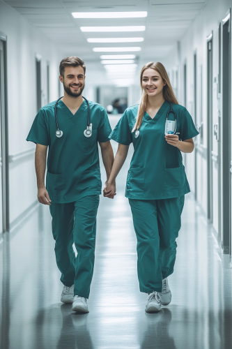 a male and a female nurse walking together down a hospital corridor. They look happy. Photo taken from the front. hyperrealistic photo, simple setting. --ar 2:3