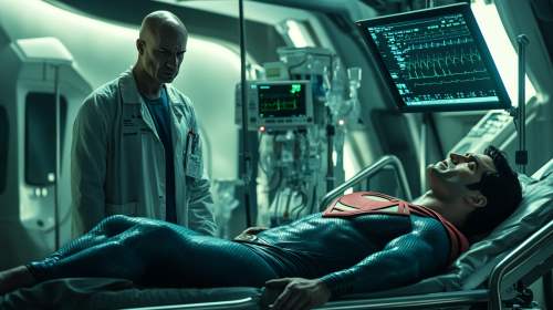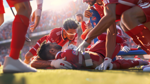 A hyper-realistic photograph of a male soccer player in a red jersey lying on the pitch, surrounded by a team of medics urgently providing first aid. One medic is holding his leg in a splint, while another is preparing a defibrillator, and others are setting up an IV. The player's face shows pain but determination. The soccer field is bathed in warm, afternoon sunlight, creating deep shadows and highlights. A sense of motion and urgency is conveyed through the medics' focused expressions and rapid movements. Nikon Z9, crisp details, vivid colors, hd quality, vivid style --ar 16:9 --v 6.0