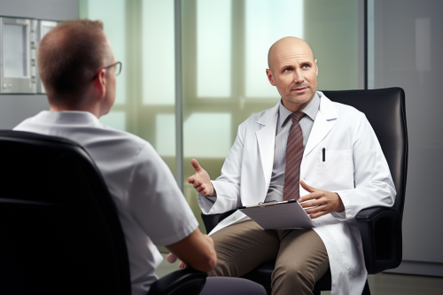 a bald patient consultation with a a doctor who has a short hair cut. The patient is asking the questions "Are there any risks or side effects to a hair transplant" and the doctor is responding --ar 3:2