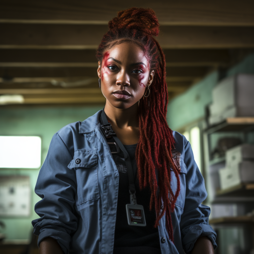 Young 20-year-old woman with black skin and African American features with red hair full of braids, zombie fight , doctor's uniform, Zombies brackground , zombie apocalypse