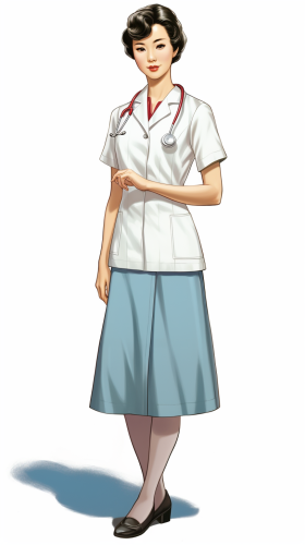 [25b529646] A Chinese female nurse in her thirties or forties is standing in the office wearing a nurse uniform. --v 5.2 --ar 9:16 --c 0