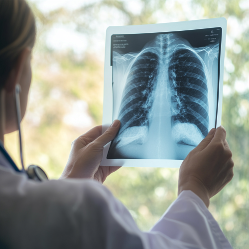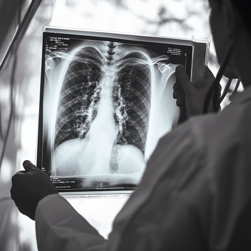 Close-up shot of a doctor analyzing a lung X-ray, with the X-ray held up against a window. The natural light from outside softly illuminates the X-ray, creating a detailed, high-contrast stroke-like effect. Next to the doctor, a transparent holographic display powered by AI technology highlights areas of concern on the X-ray. The doctor, dressed in a white lab coat with a stethoscope around their neck, is focused and professional, interacting with the AI display. The background outside the window is blurred to maintain focus on the doctor and the X-ray.