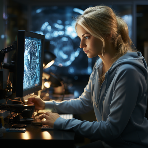 In the center of the image, a computer screen displays a detailed picture of an eyeball. The eye is depicted clearly. Light in the room subtly reflects on the screen, adding a realistic depth to the eyeball image. A woman sits at the computer in professional attire. Laboratory environment. Hyper realistic. --s 750 --style raw