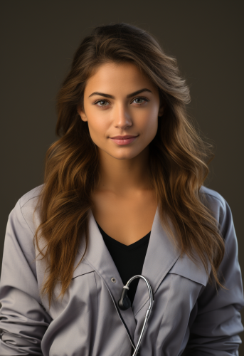 realistic photo of a female doctor with a stethoscope around her neck. smiling, relaxed, kind, skin texture, Studio lighting, white background --ar 11:16 --style raw --s 750