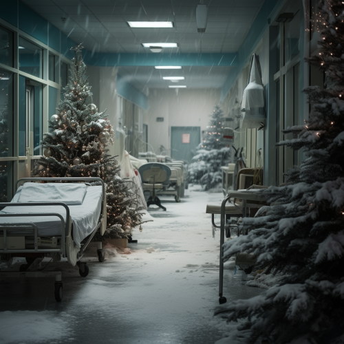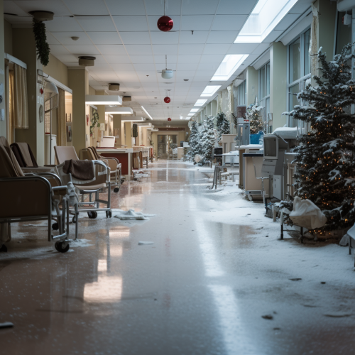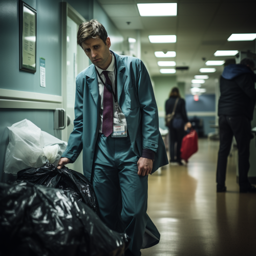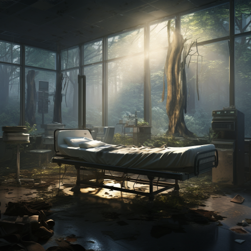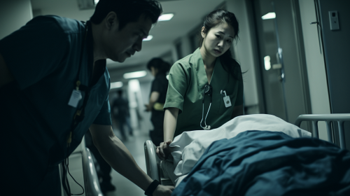 Middle shot, shot on DSLR, a doctor and a nurse trying to help and treat patients in a hospital full of patients in bed in the hallways. He is helpless and tired. She is trying to assist to the best of her capabilities. The people are dying. There is no room for passage as there are too much people. Body bags are waiting and some people are in some body bags, --v 5.2 --ar 16:9