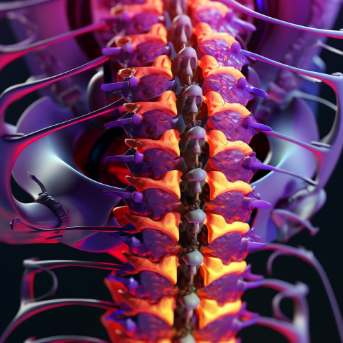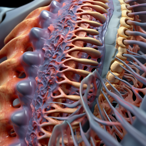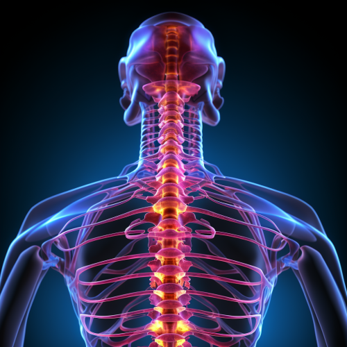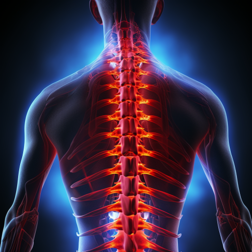 50-year-old woman hunched-over because of low back pain, she's holding her back, she is in lot of pain, her low back is radiating red to simbolise the pain
