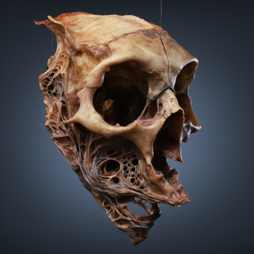 human skull with smooth surface made of bone, sharp edges, very dark setting and angled profile, bone texture matte