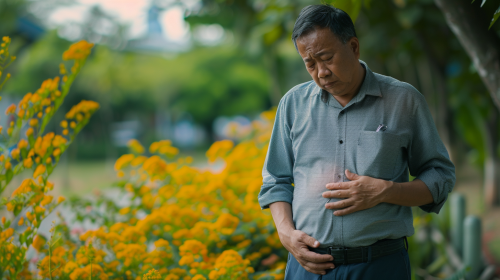 a malaysian chinese in 60's suffering from stomache pain, clutching his or her stomache, 8k, natural lighting, HDR, high resolution, shot on IMAX Laser, intricate details, --ar 16:9 --v 6.0
