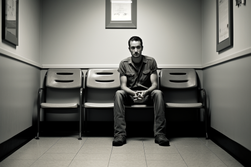 a man age 36 with very short hair who is sitting in the waiting room of a doctor's office --ar 3:2