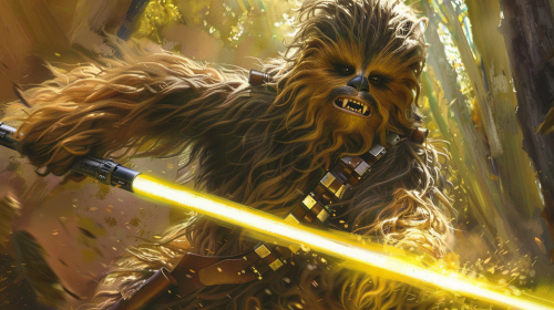 A highly detailed, close-up portrait of Yoda from Star Wars, captured in an intense moment of battle. His fierce expression and narrowed eyes are set in a powerful gaze, directed just past the camera as he holds his iconic green lightsaber firmly in his small but mighty hand. The lightsaber glows vividly, casting green light across his weathered face, enhancing the lines and textures of his skin and conveying the weight of his experience and strength. The background is a swirl of dynamic green and blue light trails, adding energy and motion to the portrait, while faint embers or sparks drift around, hinting at the fierce action surrounding him. His robes flow slightly from the movement, adding a sense of urgency and force to his stance. This portrait conveys Yoda’s power and determination as a Jedi Master, blending serene wisdom with battle-ready intensity – massurrealism, intricate details, clear features, global illumination, Nikon D850 DSLR, 200mm f/1.8 lens, f/2.2 aperture, 50k, 3D, UHD, rtx on --v 5.1 --s 1000 --ar 16:9