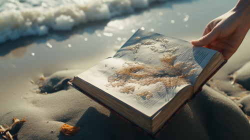 cinematic still, film by Christopher Nolan, a huge book being handed over from a giant to a small person, close up of book, in a beach --ar 16:9 --v 5.2