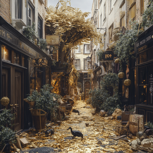 a photorealistic image from a moviea surreal twist vision of a post war london soho. The streets are paved with gold and the street furniture as turned into plants. The buildings are made of flora and fauna and the animals are made of trash - - ar 16:9
