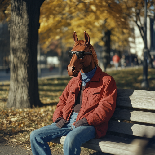 a man with a brown horse's head in a film like A24. He is sitting on a bench in a park, dressed for fall with blue jeans and a red jacket and sunglasses, he is thoughtful
