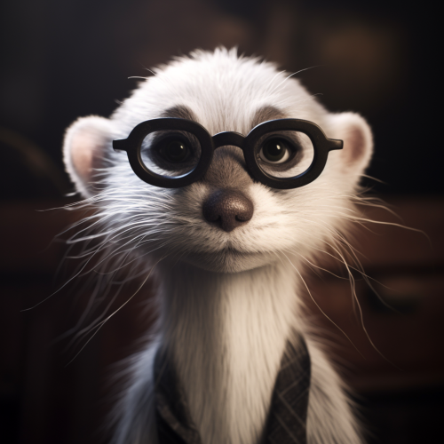 meerkat, smirking, black mens eyeglasses, clear lenses, long white beard, portrait, silent film makeup, 3d character from Disney Pixar, silent film --ar 1:1 --v 5.0
