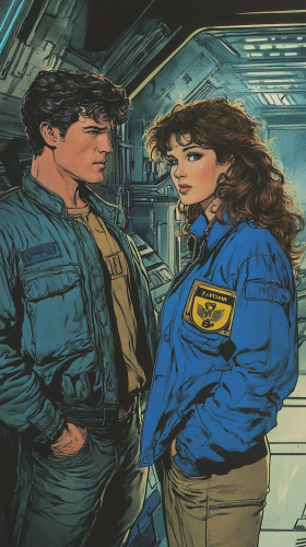 sketched portrait of an adult man with shaved messy slightly receding hair, wearing a 90s boiler suit with a meteor symbol logo on it, aged in his 30s, tired eyes, clothing inspired by the clothing from the Alien movie franchise, sci-fi, on a black background in the style of John Berkey illustrations, small dots of dull sci-fi light and stars in the background, dark space, black and white, --v 6.1