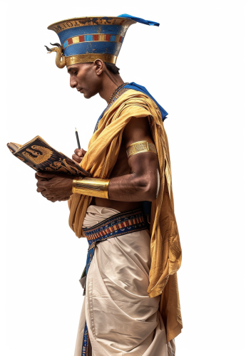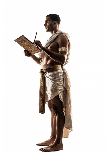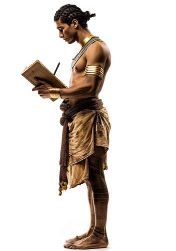 A side view full length high angle photograph of an ancient Egyptian man, holding a book and stylus, wearing an egyptian schenti, gold armbands, still from a movie, mediterranean skin tone, backlight, isolated on white. --ar 7:10 --s 50 --v 6.0