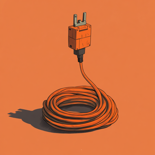 A stylized illustration of a rugged, heavy-duty orange extension cord commonly found on film sets, coiled neatly on the ground with a US 3-pronged plug raised upward in a striking, cobra-like pose. The plug is upright, angled as if ready to be connected, and the cord has visible scuffs and signs of wear from repeated on-set use. Rendered with bold lines and high-contrast shading inspired by *Archer* with anime-style detailing, the scene captures the essential film set vibe. Soft shadows and realistic highlights add depth, with subtle hints of other film equipment in the background for an authentic production atmosphere.
