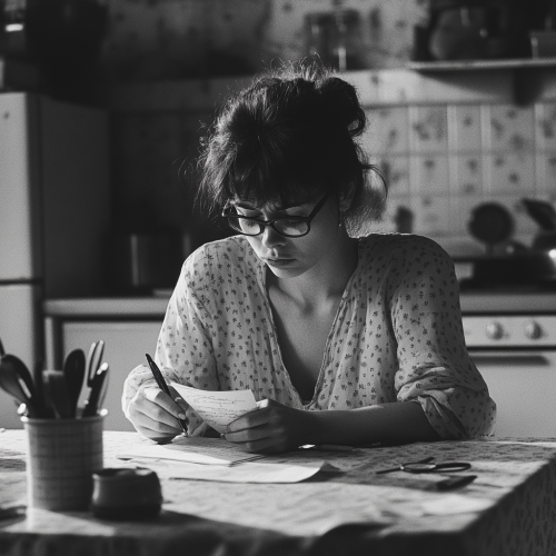 a woman in her 44 years old, wears glasses, writes a letter at the kitchen table, 1992, 90s, cineamtic movie still sho 35mm, movie 90s, she is ugly, she is upset, cinematic, emotions, dark, moody