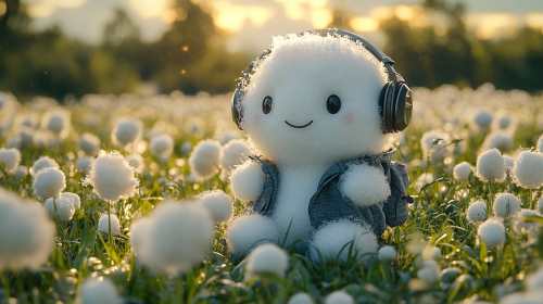 Anthropomorphic cute mashmellow white face he wears headphone, he wears viking warrior jacket growing the 8 bit pixel farm. This is a cinematic shot with high resolution and movie-grade cinematography. It was captured using Canon EOS R5 cameras and 30 mm lenses. --c 15 --ar 16:9 --s 300 --v 6.1