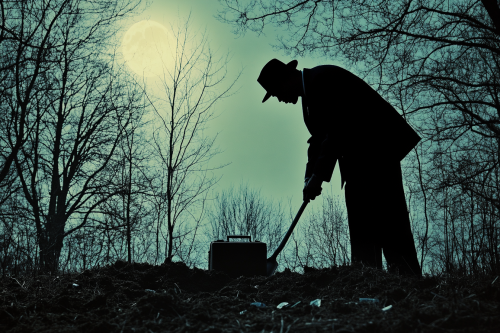 Film still silhouette of Samuel L Jackson digging up a briefcase full of money with a shovel from a hole in the ground in the woods, backlit by the moon, highly detailed, ultra realistic texture, high definition