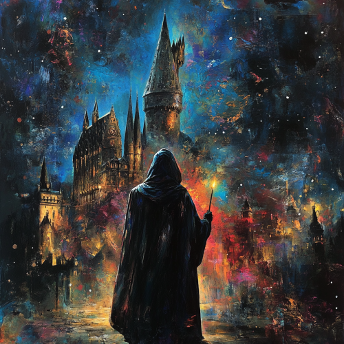 Screengrag of 1950's Super panavision 70 movie. Retro in color. Harry Potter stands in a misty graveyard, wearing a tattered, dark cloak with silver runes shimmering along the edges. His glasses reflect the pale moonlight as he clutches an ancient, glowing wand, surrounded by ghostly apparitions and swirling fog. 9:16