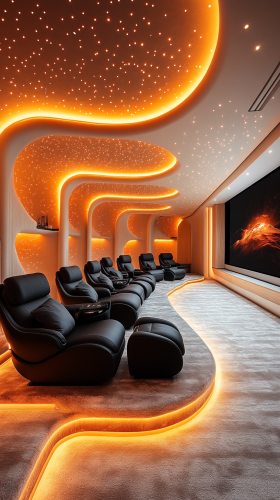 An ultra-modern home cinema with white walls and black seating, including luxurious black recliners. LED lights in an orange tone line the ceiling and baseboards, creating an immersive, ambient glow that enhances the cinematic experience. The room is equipped with a large smart screen and surround sound, giving it a high-tech edge. Ultra-realistic, ultra-high definition. --ar 9:16 --style raw --v 6.1 --s 750