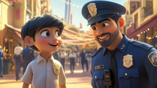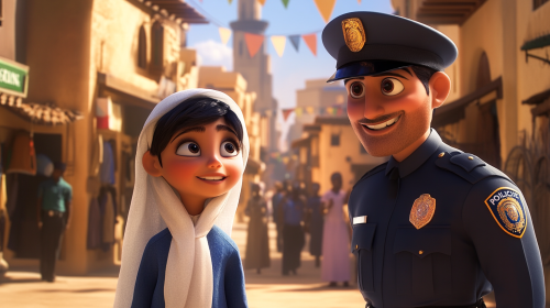 pixar and netflix collaboration for a detective kid animation series that take place in dubai. color are vibrant and the overall feel of the image is positive and intriguing. in the image we can see an emirati kid wearing kandora working with a Dubai police officer wearing the official dubai police officer uniform. they are both smiling. they look like the future of police and investigation --ar 16:9