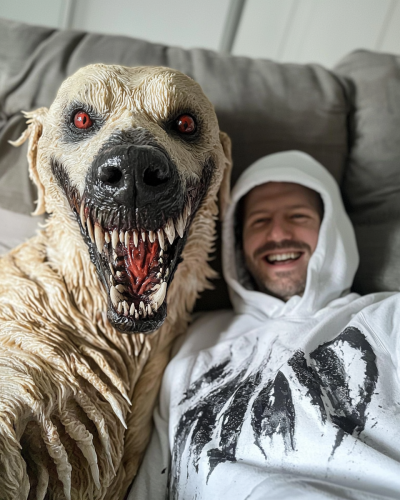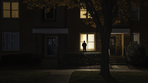 Wide shot of a dark, quiet apartment complex at night, with a single dimly lit window on the ground floor where faint shadows and subtle movement can be seen inside. A man stands outside, partially hidden by shadows, as if watching or remembering something within. The street is empty, and the scene is cloaked in darkness, only faintly lit by a single streetlamp casting an ominous glow. Ultra-realistic, 4K, ominous, and cinematic horror --ar 16:9