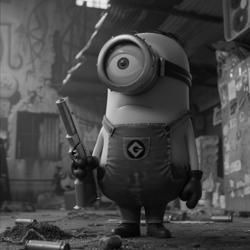 a minion is very shameful because he just committed a very bad crime, he is holding a gun behind his back, very real sorrow and innocence lost --v 6.0