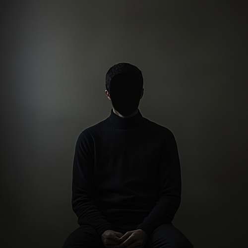 A man sitting in an interview setting, their face and body obscured in dark shadows to protect their identity. The background is softly lit to highlight the interview setting, with the person’s features hidden in silhouette or minimal light, creating an atmosphere of confidentiality and mystery. The lighting emphasizes anonymity, with subtle details showing the outline of the person’s figure but leaving their identity unrecognizable