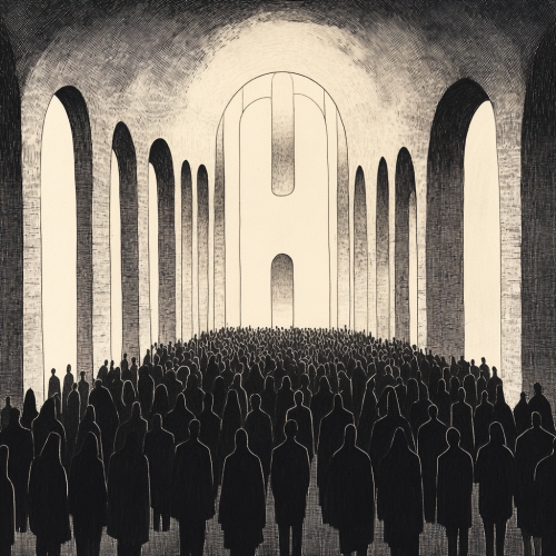 Illustrate a solitary woman standing against a plain wall, wearing a dramatic, flowing gown in the style of Edward Gorey. Use detailed cross-hatching to bring depth to her dress and to create subtle shadows around her, emphasizing the texture and volume of the fabric. Design her with a simple, emotionless expression and a statuesque posture, evoking a sense of stillness and detachment. Surround her with symbolic black bird silhouettes, carefully positioned around her to convey an atmosphere of quiet tension. Keep the background minimal, allowing the empty space to enhance the scene's sense of isolation and mystery, while staying true to Gorey's eerie, minimalist aesthetic.