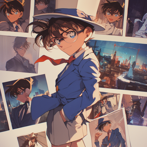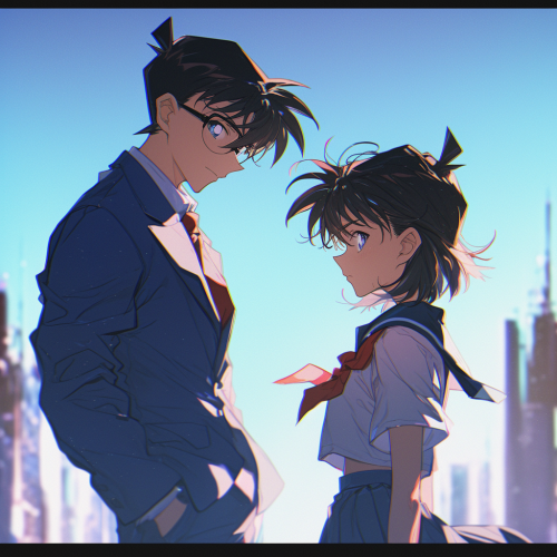 Detective Conan reimagined as a young girl with short, expressive hair and a school uniform, standing beside Kudo Shinichi, her adult male version, who faces slightly away but looks back at her thoughtfully. The scene captures the unique dynamic between the two, with Conan appearing curious and spirited, while Shinichi has a calm, reflective expression. Background is a subtle, soft-lit anime-style cityscape, adding depth and atmosphere. The mood is thoughtful, with a sense of connection and mystery between the characters. Highly detailed, vibrant anime art style. --s 750 --niji 6