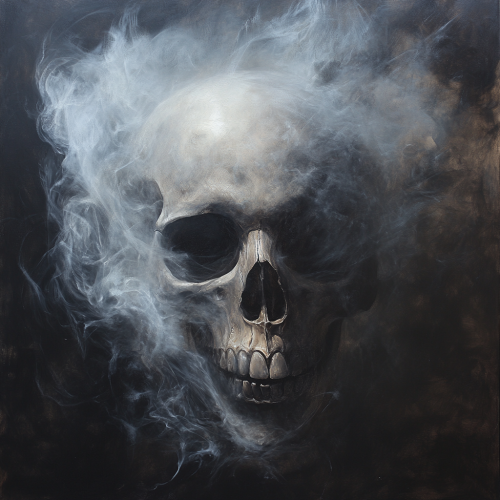A ghostly, ethereal skull half-dissolving into mist, as if evaporating into the air. The skull has hollow, haunting eyes, with wisps of smoky tendrils flowing upward, blending seamlessly into a ghostly aura. Dark, mysterious background with subtle shadows and fog, giving a supernatural and eerie vibe. Hyper-detailed, soft lighting, dramatic shadows, dark grayscale with hints of eerie blue tones. The image captures a haunting, mystical presence