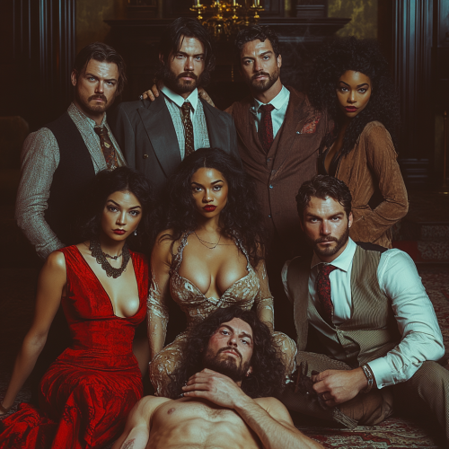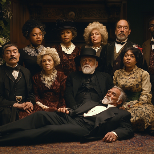 Create an image group of 10 classic physic mediums, all very different in mystery writing character with a mix of black people and older people, at a party in an old mansion with a body laying in front of them on the floor looking serious while looking suspiciously at each other ar 16:9 --s 250 --style raw