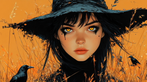 creates an image of a teenage woman dressed in black, witch hat, eyes made up with black bistro, in her right hand a scythe, black crows as friends await Halloween night by Tim Burton's style --ar 16:9 --style raw --stylize 750 --v 6.1