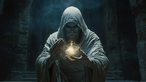 gloomy dungeon of a medieval castle..the abode of a magician and alchemist..on a long table covered with a white cloth lies a red-haired girl with her eyes closed..nearby stands a magician in a dark clothes,with a white beard and long hair,,,the magician makes passes in the air with his hands...a translucent mandala glowing with a bluish light hangs in the air above girl's body.. --ar 16:9 --v 6.1 --style raw