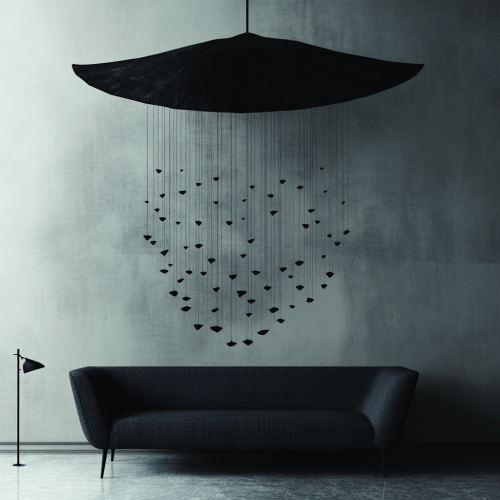 Create an eerie, minimalist scene in the style of Edward Gorey, featuring a large, dark umbrella suspended above a modern black sofa in a quiet room. From the umbrella, strings of small, dark shapes cascade downward like an ominous rainfall. Use meticulous cross-hatching to add depth and shadow, emphasizing the textures of the fabric and the delicate details of each shape hanging from the umbrella. Keep the background minimal to focus on the unusual arrangement, with empty walls and sparse furnishings, enhancing the sense of isolation and unease. Add subtle symbolic elements, such as a small, shadowed clock or a faint silhouette in the background, to invoke mystery and a feeling of quiet tension.