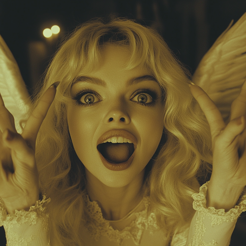 Stanley Kubrick, Eyes Wide Shut, occult mysiticsm beautiful cyber angel girl with blonde hair pointing up. She is very excited and attractive. --ar 1:1 --style raw --v 6.1