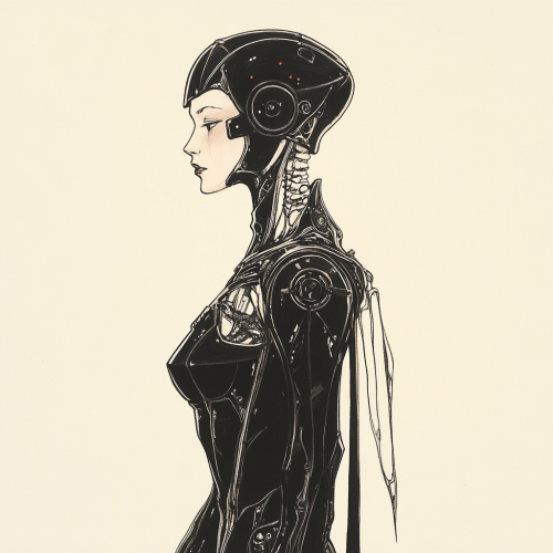 Illustrate an Edward Gorey-inspired portrait of a young woman with a somber expression, dressed in sleek, dark, and futuristic attire. Her pose is introspective, with her head tilted slightly, and she has a tattoo or symbol on her upper arm that hints at a mysterious background. Use meticulous cross-hatching to capture the glossy texture of her outfit and the subtle shadows on her skin, adding depth and dimension. Keep the background minimal, focusing on the character and her quiet, enigmatic presence. Add subtle symbolic motifs, such as faint shadows or a small, mysterious mark nearby, to enhance the mood of solitude and intrigue.