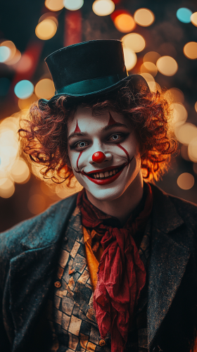 Stanley Kubrick, Eyes Wide Shut, occult mysticism beautiful cyber angel girl with blonde hair and wings. She is shaking hands with a sleek clown, alluringly and elegantly. The clown has white, red and blue face paint. Legs and skin showing --ar 1:1 --style raw --v 6.1