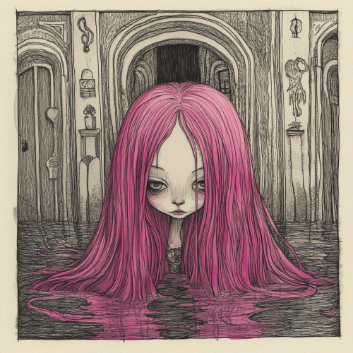 Create an illustration in the style of Edward Gorey, featuring a young woman sitting in an ornately decorated armchair, dressed in a Victorian-inspired outfit with a subtle theatrical flair. Use dense cross-hatching to capture the intricate patterns and textures of the chair’s upholstery and her attire, paying particular attention to the lace, bows, and fabric details. The character should have a minimalist, almost expressionless face with an air of detachment, typical of Gorey’s figures. Place her in a minimalistic background, allowing the emptiness around her to emphasize solitude. Incorporate symbolic motifs like a dark bird or a vintage clock to add a layer of mystery, evoking themes of elegance tinged with melancholy.