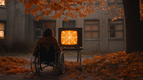 Close up of a 1982 TV sitting on a table outside of a school building at dusk surrounded by piles of orange leaves, On the TV are images of orange scanlines scrambling and forming the pagan symbol of a Pentangle, very dark sunset light, there is a strange, ghostly, haunted handicapped girl in a wheelchair covered in a brown blanket sitting behind to the TV, her head is down and mostly concealed by her hair, she is near comatose and has creepy large intense eyes with a satanic necklace, the windows of the school building are covered in dark orange, reddish curtains. camera is moving forward into a close up of the TV, the light is creepy, dark, orange and stylish, shallow depth of field, 40mm lens --ar 16:9 --v 6.1 --style raw