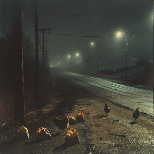 Create a captivating scene of a dark, quiet night with an empty road stretching into the distance. A few streetlights cast a warm glow, illuminating the asphalt and creating a sense of mystery. Scattered along the roadside, several brown takeaway bags are placed at intervals, with the hens taking care of that The atmosphere should evoke a sense of adventure and anticipation, inviting viewers what is happening --v 6.0 --s 250 --style raw