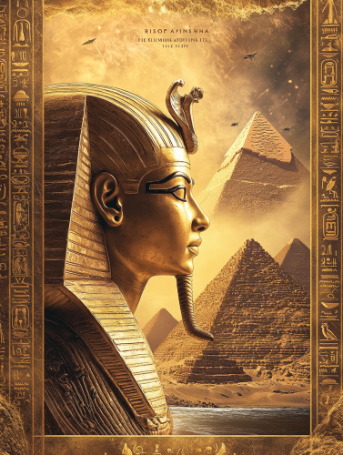 A captivating cover image featuring the ancient Egyptian Pharaoh and the iconic pyramids, evoking a sense of mystery and grandeur. In the center, a close-up side profile of a solemn Pharaoh statue adorned with a royal crown, symbolizing power and ancient wisdom. The background includes towering pyramids and the flowing Nile River, representing the magnificence and strength of ancient Egypt. The color palette is warm with desert hues, using golden and sandy tones to emphasize the historical depth. Bold golden lettering at the top reads 'Rise of the Pharaohs,' with smaller text below: 'The Kingdom of the Nile.' Designed to capture viewers’ curiosity cinematic lighting, realistic textures, vertical orientation --ar 3:4
